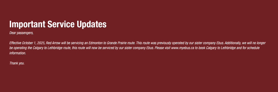 Ebus is first and foremost committed to the safety of our passengers. At the same time, we want to ensure an easy travel experience on the way to your destination. Our sister company, Red Arrow, a one-of-a-kind luxury bus service in Alberta, holds this commitment as well. While we want a pleasant ride for everyone, sometimes unexpected things happen. Be sure to have a look at our Travel Advisories page to keep yourself informed. Find information for road conditions, weather, or other service updates. For information on other items such as luggage, and what to expect when you travel with us, visit our Before You Go page.