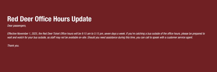 Ebus is first and foremost committed to the safety of our passengers. At the same time, we want to ensure an easy travel experience on the way to your destination. Our sister company, Red Arrow, a one-of-a-kind luxury bus service in Alberta, holds this commitment as well. While we want a pleasant ride for everyone, sometimes unexpected things happen. Be sure to have a look at our Travel Advisories page to keep yourself informed. Find information for road conditions, weather, or other service updates. For information on other items such as luggage, and what to expect when you travel with us, visit our Before You Go page.